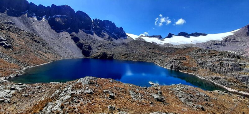 Today leaving Corralpampa; after a good wholesome breakfast, with our crew (including porters) to take our climbing equipment, tents, sleeping bags to the laguna of Juchuycocha which sits at the base of the glaciers above. The trail up is a continual ascent zig-zagging up mountainside; eventually reaching morraine near the laguna. It is a long hard day but with plenty of stops, snacks and water along the way the ascent to the laguna is achieved in around 5-6 hrs.